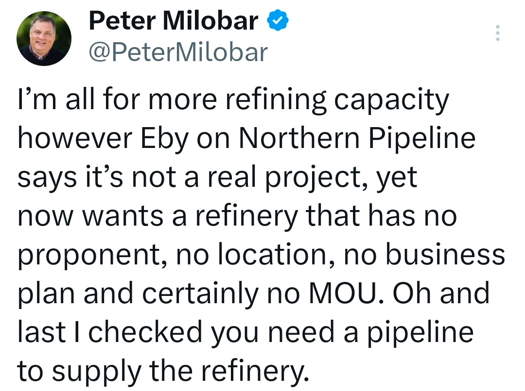 A refinery requires exactly what Eby continues to oppose: infrastructure. It needs a proponent, a location, a business case, regulatory certainty, and critically, a reliable supply of oil. As Conservative MLA Peter Milobar put it, a refinery without a pipeline is not a serious proposal. It’s an idea without a foundation.